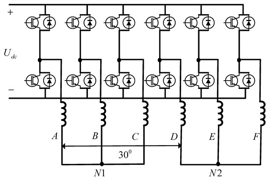 A dual Y shift 30 degrees permanent magnet synchronous motor (DT_PMSM) has two sets of identical three-phase stator windings, which are spatially shifted by 30 degrees with two isolated neutral points, as shown in Figure 1. It has the advantages of low torque ripple, high power density and good fault tolerance ability in comparison with traditional three-phase motors [1,2,3,4].