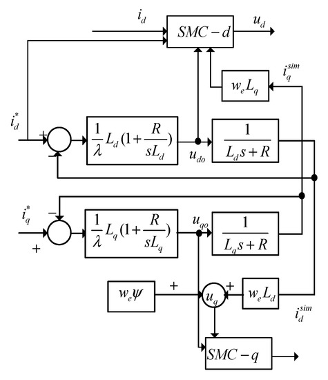In order to improve the performance of IMC strategy shown in Figure 4 and enhance the robustness of the system, sliding mode control (SMC) strategy is introduced to make the output meet the requirements of Equation (12). Since the system has robustness to disturbance only in the sliding mode stage, in order to ensure the robustness of the system, it is necessary to make the system work in the sliding mode stage as far as possible in the whole motion process. Therefore, the sliding mode surface for d-axis current is defined as