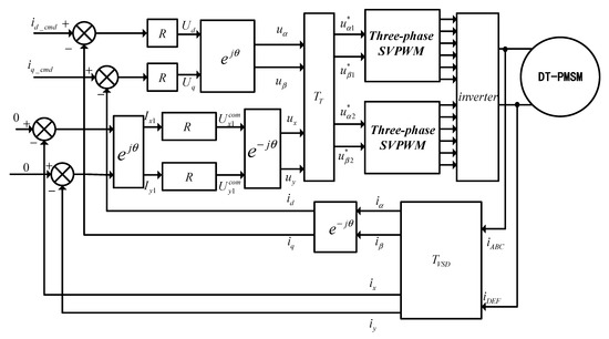Dead time insertion is necessary in order to ensure the safety of the inverter, which will introduce error voltages and make the phase currents distorted. From the perspective of the inverter, the error voltage can be calculated and compensated according to the nonlinear characteristics of the inverter [14,15]. However, it needs the exact system parameters of the drive system and the polarities of phase currents. False current polarities will deteriorate the control performances. The Proportional-Integral (PI) controller implemented in positive- and negative-sequence synchronous reference frames (SRF) can achieve zero steady-state error at different orders [16,17,18]. However, the computational burden is heavy. Accordingly, resonant controller can reduce the computational burden, which can be employed in the harmonic subspace to eliminate the harmonic currents in [19,20]. But the stability analysis is not given.