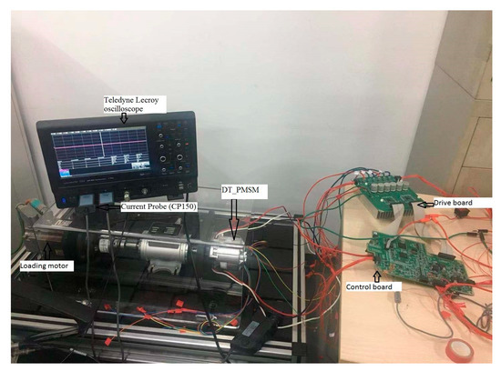 Figure 10 shows the experimental platform of DT_PMSM where the performance of the suggested control algorithm is verified. It consists of a DT_PMSM, a brushless direct current motor (BLDC) dynamometer, a drive board and a control board. The BLDC dynamometer operating in the speed-control mode or load torque mode can be used as a loading machine. The DT_PMSM is fed by a two-level VSI, which is connected to 12 V DC bus voltage. The PWM cycle is 50 μs and the dead time is set to be 1 μs. The control actions are performed by an Aurix TC277 DSP which provides 12 PWMs.