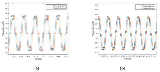 Phase currents after adopting the proposed algorithm in x-y subspace, (a) running at 500 r/min and (b) running at 1500 r/min.