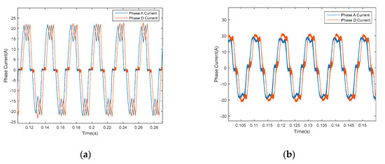 The speed of DT_PMSM is maintained at 500 r/min and 1500 r/min, respectively. The experimental performances are illustrated in Figure 17 without employing the resonant controller when the command currents of d- and q-axes are 0 A and 20 A, respectively. The values of ux and uy are 0. The THDs of phase A current are 23.27% and 16.10%, respectively, as illustrated in Figure 18. Moreover, at the same speed, the THD in this case is larger than the THD when the command currents of d- and q-axes are 0 A and 35 A because the fundamental component of phase current is smaller in this case.