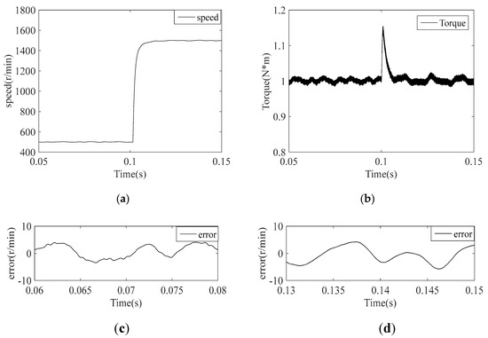 Waveforms after a speed step change from 500 r/min to 1500 r/min under 1 N*m load conditions without the proposed current regulator. (a) Speed response. (b) Electromagnetic torque response. (c) Error between the actual speed and reference speed (the reference speed is 500 r/min). (d) Error between the actual speed and reference speed (the reference speed is 1500 r/min).