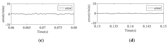 Waveforms after a speed step change from 500 r/min to 1500 r/min under 1 N*m load condition with the proposed current regulator. (a) Speed response. (b) Electromagnetic torque response. (c) Error between the actual speed and reference speed (the reference speed is 500 r/min). (d) Error between the actual speed and reference speed (the reference speed is 1500 r/min).