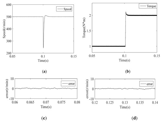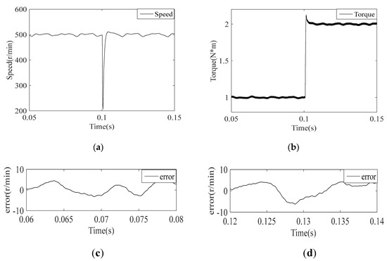 Waveforms after a load torque change from 1 N*m to 2 N*m with the proposed current regulator. The reference speed is 500 r/min. (a) Speed response. (b) Electromagnetic torque response. (c) Error between the actual speed and reference speed (load torque is 1 N*m). (d) Error between the actual speed and reference speed (load torque is 2 N*m).