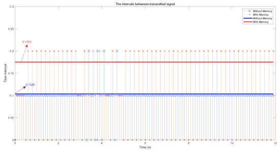 The state trajectories and intervals for with and without memory control. (a) The state response of the systems without memory control; (b) the state response of the systems with memory; (c) the intervals between transmitted signals without memory control; (d) the intervals between transmitted signals without memory control.
