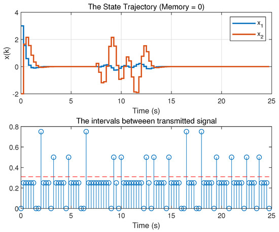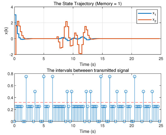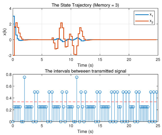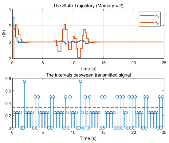 Thus, for the above given controller gains, for s (otherwise ), and initial condition , the simulations conducted for , and 4 are drawn. From the results, the average transmission rate is calculated using the information of accumulated total transmitted signals. The results are shown in Table 2. From Table 2 it can be noticed that the larger number of the memory is utilized, the better average transmission intervals will be. Figure 9 shows the compared average transmission rate for different memory N. It apparently displays the effect of memory elements. As memory increases, less transmitted information is transmitted, which means consuming less cost or energy.