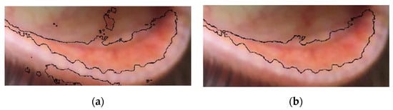 In [37], the segmentation of the conjunctiva is obtained manually with the assistance of an algorithm based on SLIC Superpixel, while in [38] the same authors propose automatic segmentation and optimization of the region of interest of the eyelid conjunctiva (see Figure 4). Segmentation of the conjunctiva’s area of interest is obtained in two phases: in the first one, image processing algorithms are applied; the second one is based on the study of the brightness of the image.