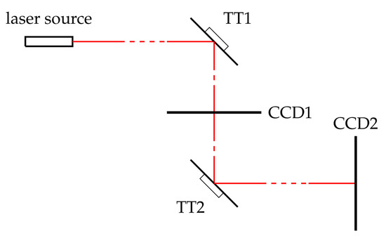 The device, simplified in Figure 1, is a standard optical alignment system composed of two planar tip-tilt mirrors [23] (TTs), each driven by two couples of motors. Coarse positioning is obtained via two coarse-motors, while two piezo-motors are employed for fine-tuning. In the optimization process, only the piezo-motors are considered.Two charge-coupled devices (CCDs) detect the position of the laser beam in two different places along the path (the CCDs do not intercept the laser beam thanks to the use of semi-reflecting mirrors).