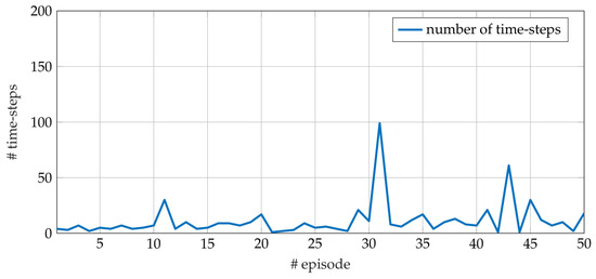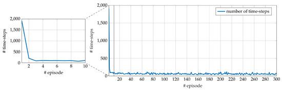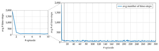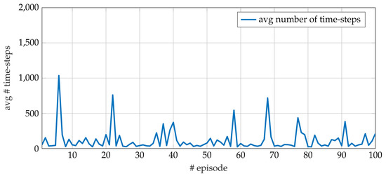 The average number of time-steps per episode for the whole training phase is reported in Figure 3. The steep decrease of the average number of time steps shows that a few episodes are sufficient to get a performance close to the one obtained after a whole training phase. Indeed, thanks to the reward shaping (10), the Q-function is updated at each step of each episode instead of just at the end of the episode (see Section 5.3 for further details). The average number of time-steps per episode during the test phase is visible in Figure 4 and is consistent with the training results.
