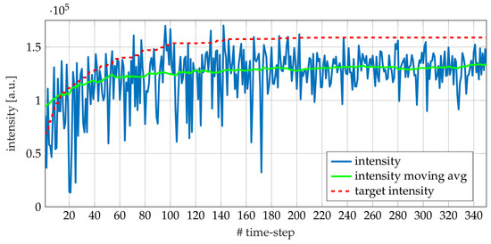 Intensity during a single run of Natural Policy Gradient (NPG) REINFORCE on EOS. The blue line represents the detected intensity, while the green line is its moving average obtained with a fixed window size of 50 samples. The dashed red line represents the target intensity. Until time-step 200 the improvement of the intensity is appreciable; a further evidence is the update of the target intensity. In the remaining time-steps, the target intensity exhibits only small updates.