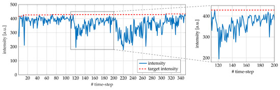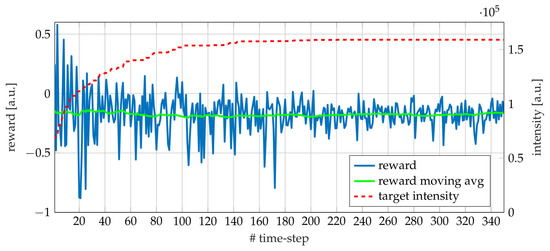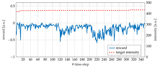 The training of the EOS alignment system consists of 300 episodes. The number of episodes has been chosen after preliminary experiments on a EOS device simulator. However, based on the results obtained on the real device, the number of episodes can be actually reduced (see Figure 3). At the beginning of the training, the ROIs are selected, and therefore also the target value . They remain the same for all the training episodes. At each time step k, the input provided by the agent is applied, and the new intensity is compared with the target (). The episode ends in two cases: