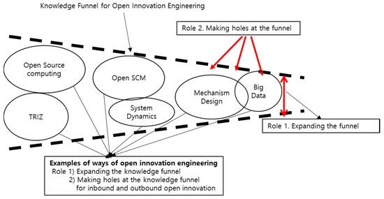 Open innovation engineering concept model includes diverse open innovation engineering channels such as open source computing, theory of solving inventive problem (TRIZ), open supply chain management (SCM), system dynamics, mechanism design or big data, as shown in Figure 1. Open innovation engineering channels have two major functions such as (1) expanding the knowledge funnel vertically; (2) making holes at the knowledge funnel for the motivation of inbound and outbound open innovation. Open source computing and TRIZ are located at the near -side of the research parts of the knowledge funnel. Open SCM and system dynamics are located in the inside of knowledge funnel, and mechanism design and big data are located near-side of market and society at the knowledge funnels.