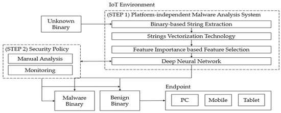 6], Linux accounts for 71.8% of the operating systems used for IoT devices, gateways, and cloud back-end devices, and the application of Linux to industrial devices is also expanding. However, pattern-based and AI-based malware analysis techniques are mostly limited to Windows malware, and there is no Linux-based anti-malware technology which use is expected to increase significantly in the IoT/embedded environment. In addition, the development of malicious code response technology that can operate in various architecture environments is complicated because it is mainly based on network logs. Second, an endpoint environment that is not affected by the platform should be considered. The proposed model can classify malware that penetrates endpoints based on AI-based malware analysis technology that is not affected by the platform. The existing AI-based malware analysis technology consisted mainly of analysis and research on Windows, Android, etc., and the analysis technology of many architectural/operating system combinations in Linux or IoT environments was not fully studied. Thus, the platform-independent malware analysis proposed in this paper is a malware analysis technology that can be commonly applied to any binary data regardless of the architecture or type of operating system. It is applied to a 5G/IoT environment and its performance and results have been verified using open data sets and self-collected data sets. The system is an effective and sustainable model that can apply separate security policies, such as expert analysis, to complement each other’s inherent technology shortcomings.