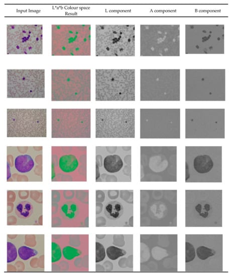 The digital microscope images are RGB color images. The entire ALL Images are generated from digital microscopes and usually in RGB color space, which is difficult to segment. Therefore, the RGB image is converted into a LAB color image. The L*a*b* space consists of a luminosity layer L* and chromaticity layers a* and b*. Here, the color information is represented in two components, i.e., a* and b*. Due to the low color dimension, L*a*b* color space is mostly employed in color-based clustering [33,34]. The sample outputs of LAB color conversion are shown in Figure 2.