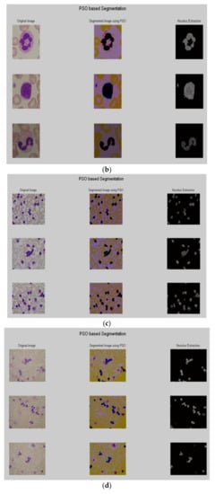 After the preprocessing, PSO based segmentation algorithm was utilized to segment the nucleus. The results of some sample images are shown in Figure 3a–d.