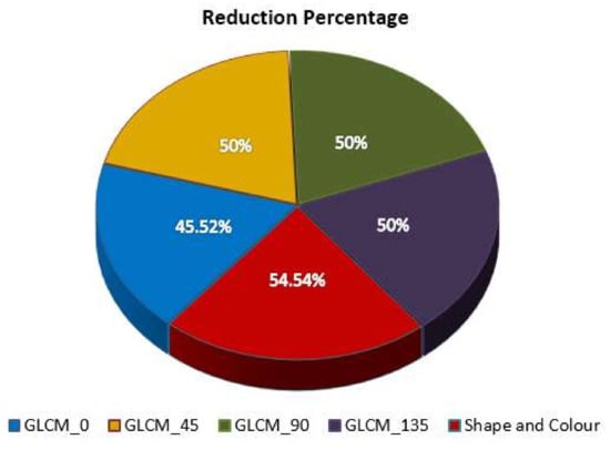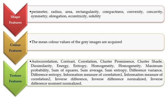 In medical image processing, the process of detection and description of global or local properties of objects present in images is called feature extraction. In the present research, different categories of features were extracted, namely shape-based, color-based, and texture-based features [36,37,38,39]. The leukemia image consists of a massive nucleus of irregular shape and size. The shape is a fundamental feature that describes the physical characteristics of an image. It can be corrupted by noise, random distortion, and obstruction. This leads to image recognition in a more complex process. Colour-based features represent the colour components of an image. Leukemia images are in RGB colour format so that it is a discriminative feature of blood and bone marrow cells [11]. The texture feature describes the organization of the basic elements of an image. Hence, it is not desirable to distinguish the images based on colour-based features alone. Many methods are available to describe the texture features and one of the commonly used measures is the gray-level co-occurrence matrix (GLCM). In this research, GLCM was computed for dimensions 0°, 45°, 90° and 135°. In texture-based features, gray level co-occurrence matrix (GLCM) was computed for the dimensions 00, 450, 900, and 1350. For each segmented image, a total of 110 features were extracted, which consisted of 11 shaped-based features, 88 texture-based features (i.e., each dimension 22 features), and 11 color-based features [40,41,42]. A detailed delineation of the extracted features is presented in Figure 4.