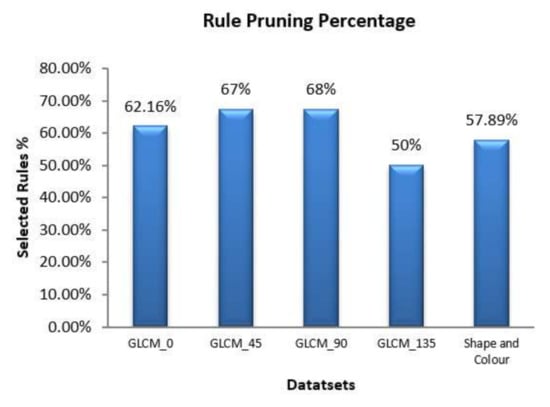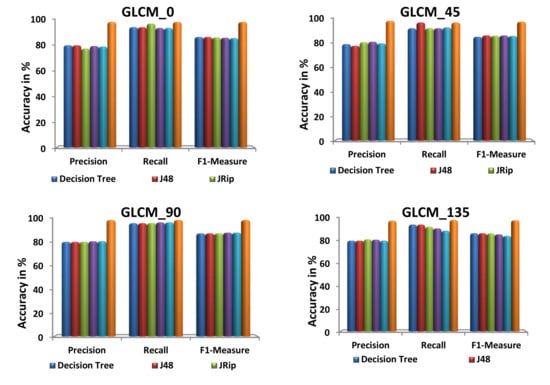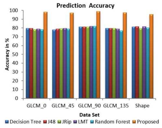 Figure 7 exhibits the performance of decision tree, J48, JRip, random forest, and the proposed DSSRMP for each dataset based on prediction accuracy. It is found that the proposed algorithm gives higher prediction accuracy value. With respect to the GLCM_90 dataset, the highest predication accuracy value, i.e., 99% is achieved. On the contrary, the lowest prediction accuracy value, i.e., 77% is produced by the random forest (RF) classifier concerning the GLCM_135 dataset. It is pointed out that the classifier’s decision trees and J48 achieved a prediction accuracy of about 80%.