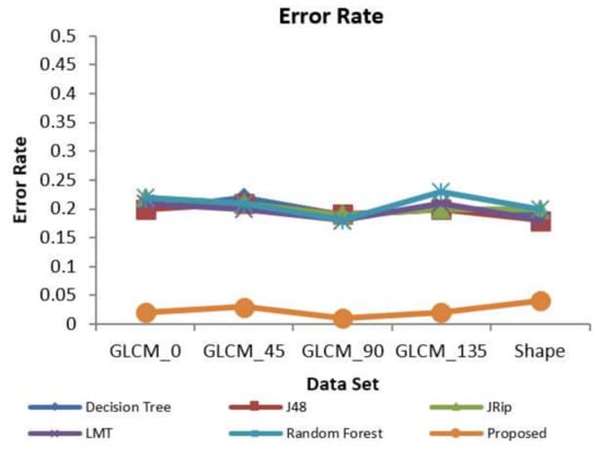 The error rate is calculated as the number of all incorrect predictions divided by the total number of inputs. The best error rate is 0.0, however, the worst is 1.0. Figure 8 shows the classification error rate values for various classifiers and the proposed decision-making algorithm with respect to all feature extracted datasets. The proposed IDSSDRP algorithm gives the best error rate values, i.e., less than 0.05. In this graph, it is also noted that the random forest algorithm gives rise to an error rate of 0.23 (relatively higher value) with reference to the GLCM_135 dataset.
