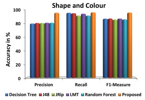 Table 10 shows the experimental results of different classification approaches for shape and colour dataset. From the interpretation of results, it is believed that the proposed algorithm achieved 95% of prediction accuracy, which is the minimum accuracy value when compared to the results of other algorithms.