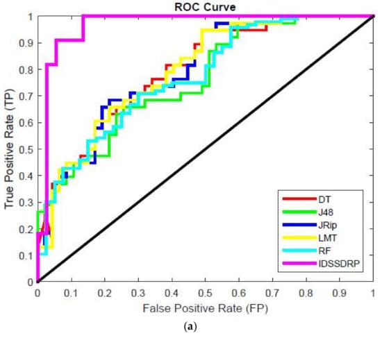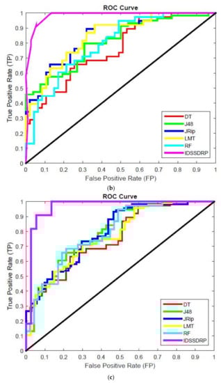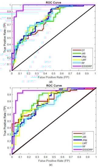 Figure 10a–e shows the ROC curve analysis of the proposed IDSSDRP and the existing decision-making algorithms. The ROC curve evaluates the graphical performance of the proposed improved dominance soft set-based decision rules making with the pruning algorithm (IDSSDRP). With respect to all the datasets, i.e., GLCM_0, GLCM_45, GLCM_90, GLCM_13, and shape and color, the proposed decision-making algorithm performed much better than the other existing classification algorithms. The curve of the IDSSDRP algorithm appears in the top left border of the ROC graph. This means that the proposed approach correctly diagnosis the blast and non-blast cells.