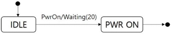 An example of a state machine is shown in Figure 1. This state machine has two states and a transition function. The set of the states is S = {IDLE, PWR ON} and the transition function is σ = {{IDLE, PwrOn, Waiting (20), PWR ON}}. The initial state is s0 = IDLE. The final state is SΨ = PWR ON. The input is I = {PwrOn}, and the output is O = {Waiting (20)}. The input in IDLE state is PwrOn. If PwrOn is entered, the state becomes PWR ON state after 20 s.