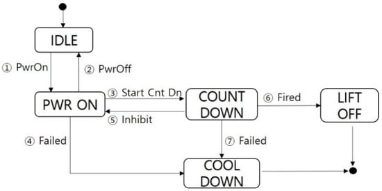 This FSM consists of six inputs, I = {Pwr On, Pwr Off, Start Cnt Dn, Inhibit, Fired, Failed}, and five states, S = {IDLE, PWR ON, COUNT DOWN, LIFTOFF, COOLDOWN}.