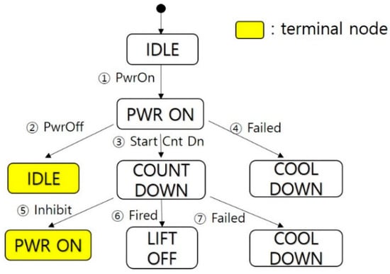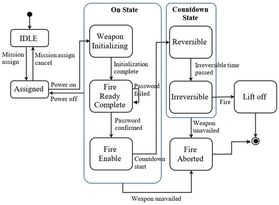 An FSM can be represented by a state transition diagram. State-based languages, such as Statecharts [], SDL (Specification and Description Language) [], and UML are used for state transition diagrams. In this study, the UML state machine is used to represent FSM.