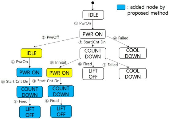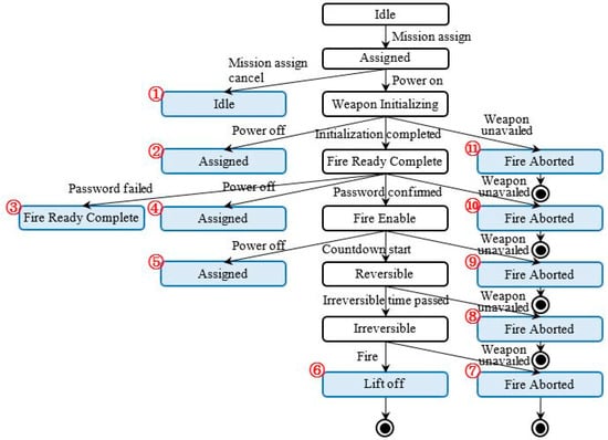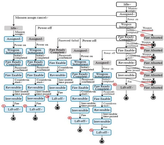 The other error was detected in test sequences no. 5 […→Assigned→…→Fire Enable→Assigned→ …→Fire Enable→…→Lift off]. The original sequence of W method is […→Assigned→Weapon Initializing→Fire Ready Complete→ …]. The error is that the firing authority was permitted without checking for a password. In the initial entry to the “Fire Enable” state, password checking was performed successfully, but in the re-entry, the firing authority was given without checking for a password. This error is also a fatal error in that a missile can be fired by a person who does not have the authority. These errors appeared repeatedly when the same software is used without debugging the errors.