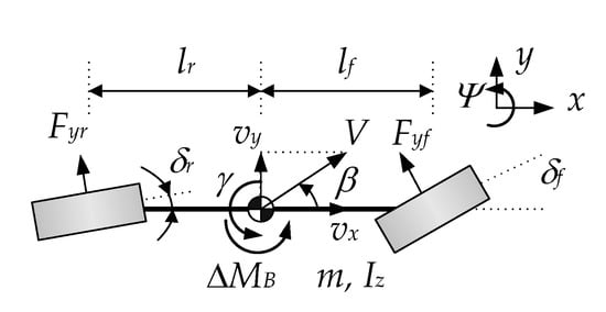 Figure 1 shows the model. There are two motions in the model: yaw and lateral motions. It is assumed that the longitudinal velocity vx is constant. Therefore, the state variables of the model are the yaw rate, γ, and the side-slip angle, β. With these state variables, the equations of motion for the model are given as Equation (1). In Equation (1), ΔMB is the control input, i.e., the control yaw moment that is to be generated for vehicle stability. The tire slip angles αf and αr are calculated with γ, β, and vx as Equation (2). In Equation (1), it is assumed that the lateral tire forces, Fyf and Fyr, of front and rear wheels are nonlinear functions of the tire slip angles, αf and αr, as shown in Equation (3), respectively [23]. The reference yaw rate, γd, is algebraically calculated from the steering angle of front wheels, δf [21].