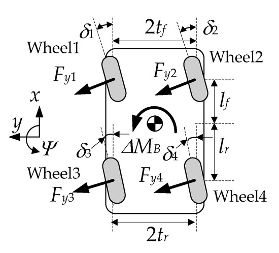 Equation (8) shows the force-moment equilibrium between Fy1, Fy2, Fy3, Fy4 and ΔMB, given in Figure 2 [21]. The objective function of WPCA is defined in Equation (9). The objective function, Equation (9), is used to minimize the lateral tire forces satisfying Equation (8).