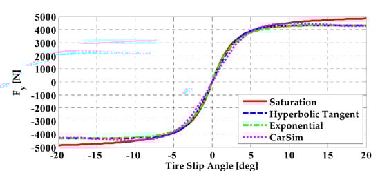 The third method is to use an inverse of lateral tire force model. Equations (19)–(21) show the exponential, hyperbolic tangent and saturation tire models, respectively [31]. There are two tuning parameters, Cα and κ, in these models if the tire–road friction coefficient μ, the vertical tire force Fz, and tire slip angle α are given. Figure 3 shows the fitting results of these models to CarSim data [32]. As shown in Figure 3, the exponential and hyperbolic tangent models are well fitted.