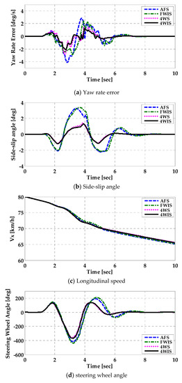 Without control, the vehicle lost its stability because the tire–road friction coefficient was low and the vehicle speed was high. In other words, the steering wheel angle, the yaw rate and the side-slip angle of the uncontrolled vehicle diverged. In contrast to this case, the controlled vehicles maintained their stability. Figure 4a,b shows that the controlled vehicles with 4WS and 4WIS satisfy the FMVSS 126 criteria. On the other hand, the vehicles with AFS and FWIS cannot satisfy the lateral stability criteria. As shown in Figure 4c, the vehicle speeds are nearly identical to one another among steering actuators because there are no braking inputs. Figure 4a shows that the yaw rate errors of FWIS and 4WIS are slightly better than those of AFS and 4WS, respectively. This means the fact that the independent steering actuators, FWIS and 4WIS, are superior to AFS and 4WS. As shown in Figure 4b, the most notable feature of 4WS and 4WIS is that the side-slip angle is reduced by them, compared to AFS and FWIS. This is the effect of rear wheel steering (RWS), as pointed out in [21,32]. Other effects of RWS are the smaller steering wheel angle and lateral offset error from the centerline of the road, as shown in Figure 4d,e. Moreover, RWS makes the convergence of steering wheel angle and lateral offset error faster.