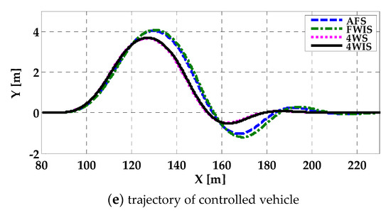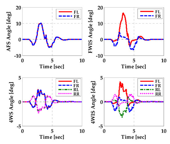 The magnitudes of the steering angle of 4WS and 4WIS are smaller than those of AFS and FWIS, as shown in Figure 5. This is caused by the use of RWS and RWIS in 4WS and 4WIS, respectively. Moreover, the direction of RWS is opposite to that of AFS in case of 4WS and 4WIS, as shown in Figure 5. This has been a widely adopted method in applying RWS to vehicle stability control [14,18,32]. The results given in Figure 5 show the advantage of FWIS and 4WIS over AFS and 4WS, respectively. For FWIS and 4WIS, the steering angle of front inner wheel should be larger than that front outer one when cornering. FWIS and 4WIS can give better control performance than AFS and 4WS because it can generate larger lateral tire forces, as shown in Figure 5.