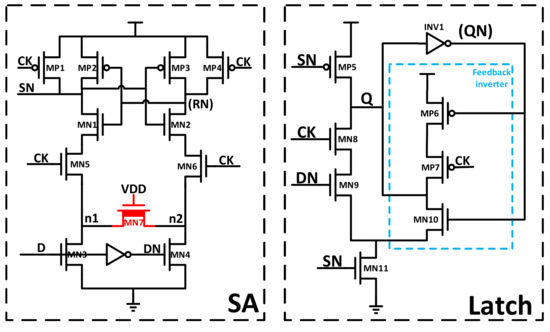 The schematic of the proposed SAFF is shown in Figure 5. As shown in Figure 5, the SAFF is composed of a SA stage and a slave latch, similar to the previous SAFFs. As described in previous sections, the SA stage could capture the data right after the rising edge of CK and the slave latch is applied to maintain the output during the negative half cycle of CK.