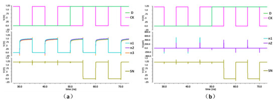 The voltages of the internal nodes in (a) the conventional SAFF’s sense-amplifier (SA) stage; (b) the proposed SAFF’s SA stage.