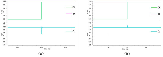 The most commonly used flip-flop in digital systems is the master–slave flip-flop (MSFF). The schematic of the C2MOS [2] master-slave flip-flop in the SMIC 55 nm standard cell library provided by the foundry is shown in Figure 1. As shown in Figure 1, the data should pass through the first latch before the rising edge of CK, which ensures that the flip-flop can capture the correct data at the rising edge of CK. Therefore, the setup time in the MSFF is relatively long. At the same time, the CK-to-Q delay involves several logics and is also relatively large.