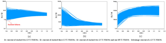 As described in [13], the always-on transistor leads to function failures at low supply voltages. Even though the detection logic in [13] solves the low voltage function failures well, the complex logic increases the delay and power consumption. In this paper, MTCMOS optimization is employed to overcome the problem. To avoid suffering low voltage function failures, the driving capability of the always-on transistor should be weaker than that of the pull-down transistors. When the driving capacity of two stacked LVT-NMOSs and the always-on transistor becomes larger than that of two stacked LVT-NMOSs due to technological variation, the SAFF suffers function failures. When the always-on transistor is LVT-NMOS, three LVT-NMOSs are stacked. As shown in Figure 8a, the current of three stacked LVT-NMOSs can be larger than that of two stacked LVT-NMOSs (I1 / I2 < 1) at low supply voltages, and function failures occur. When the always-on transistor is changed to HVT-NMOS, which means two LVT-NMOSs and one HVT-NMOS are stacked, the function failures no longer occur since the current of two stacked LVT-NMOSs and one HVT-NMOS is always smaller than that of two stacked LVT-NMOSs (I1 / I3 > 1 all the time). Furthermore, the current of two stacked LVT-NMOSs and the always-on transistor needs to be larger than the leakage current to ensure correct operation. As shown in Figure 8c, when the always-on transistor adopts HVT-NMOS, the condition is still satisfied. Therefore, the problem of low voltage function failures can be well solved by multi-threshold optimization. In the proposed design, the always-on transistor is high-threshold, while others are low-threshold, as shown in Figure 5.
