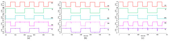 Transient waveforms of the proposed SAFF: (a) CK period = 10 ns, setup time = 5 ns; (b) CK period = 1 ns, setup time = 0; (c) CK period = 1 ns, setup violation.