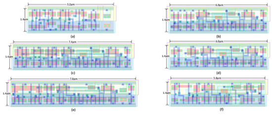 Layouts of (a) the master-slave flip-flop (MSFF); (b) the conventional SAFF; (c) Nikolic’s SAFF; (d) Lin’s SAFF; (e) Jeong’s SAFF; and (f) the proposed SAFF.