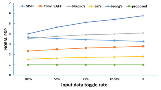 Normalized power-delay-product (PDP) under different input data toggle rates.