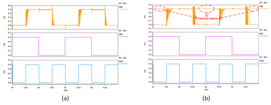 Monte Carlo simulation waveform at the voltage of 0.4 V. (a) The proposed design; (b) Conventional SAFF.