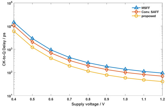 CK-to-Q delay of the proposed flip-flop (FF) as well as that of the MSFF and conventional SAFF at different supply voltages ranging from 0.4 V to 1.2 V.