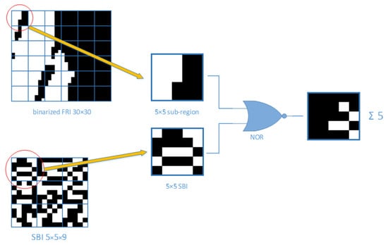 At the aim of handling real-time and resource-limited applications, Desai et al. [10] proposed a new feature description method based on the theory of compressed sensing, the SYnthetic BAsis Feature Descriptor Algorithm (SYBA). SYBA algorithm starts with the FRI (Feature Region of Interest) binarization using the average intensity of the region as the threshold. The randomly generated SBIs (Synthetic Basis Images) are overlaid onto the sub-regions of the binarized FRI, to perform a NOR operation. The sum of all pixel-wise NOR results serves as an element of the feature descriptor. This operation intends to measure the similarity between the sub-regions of FRI and the SBIs. The diagram of the similarity measurement for SYBA algorithm is shown in Figure 1.