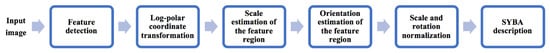 Figure 8 shows the flowchart of the SR-SYBA algorithm. The ORB (Oriented FAST and Rotated BRIEF) algorithm is used to detect feature points in the grayscale image. A small circular feature region surrounds each feature is transformed to the Log-polar coordinate system. The transformed image is then used to estimate its scale and orientation representations. The original rectangular feature region in the Cartesian coordinate system is resized to a reference scale and rotated to a reference orientation (horizontal) according to its scale and orientation representations. After the scale and orientation normalization, the SYBA algorithm is applied to the normalized feature region to calculate a feature descriptor for matching.
