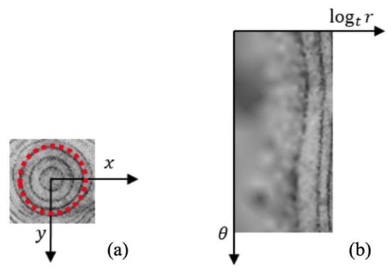 Given the radius for coordinate transformation in the Cartesian coordinate system, the corresponding logarithmic base and angular sampling interval can be obtained through Equations (3) and (4). Then the transformed image size of is also determined. Back-projection strategy is used in actual implementation of this coordinate transformation. For a point in the Log-polar coordinate system, we first calculate its corresponding location in the Cartesian coordinate system, then use a bilinear interpolation algorithm to obtain its pixel value. Figure 3 shows an example of this Log-polar coordinate transformation.