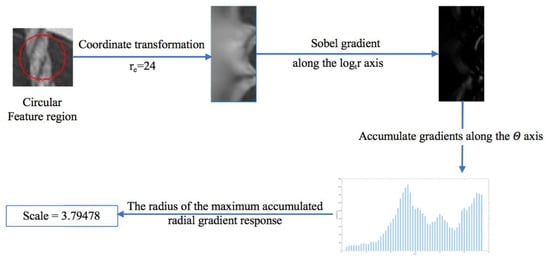 The proposed method uses the location of the maximum gradient along the radial direction to represent the scale of a feature region. The estimation of the scale representation of a feature region is shown in Figure 4. First, we transform the circular feature region in a 24-pixel radius into Log-polar coordinates using Equations (1) and (2). Second, we perform a one-dimensional gradient operation on the transformed Log-polar image to obtain the horizontal gradient along the log-radius (horizontal) axis. We sum the gradient values along the angular (vertical) axis for each log-radius to form a one-dimensional accumulated gradient with the radius as its index. We locate the maximum of the accumulated gradient and use its corresponding radius to represent the scale of the feature region. In other words, we use the radius of one of the concentric circles that has the largest accumulated radial gradient in the Cartesian coordinate system to represent the scale of the feature region.