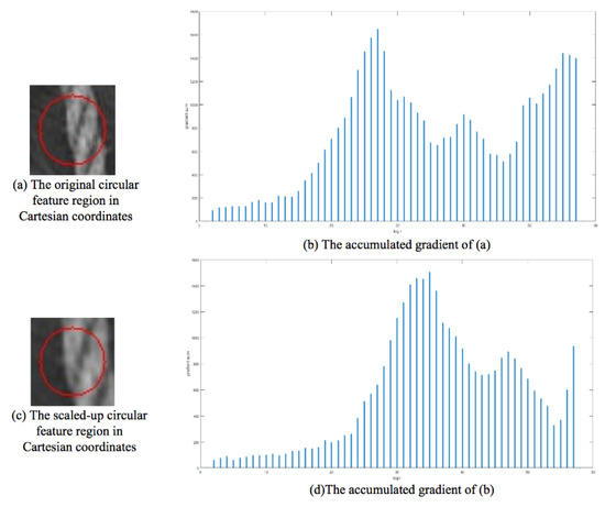 Equation (14) shows that, for a scaled and rotated feature region, the translation of the maximum accumulated gradient is proportional to the scale factor . An example of the translation of the maximal accumulated gradient is shown in Figure 5. Figure 5a shows a feature region from an actual image. Figure 5c is the same region but enlarged by 1.5 times and cropped to have the same size as Figure 5a. The accumulated gradient of the original region and the enlarged region are plotted separately and shown in Figure 5b,d. The maximum gradient shifts to the right along the axis because of the scale factor 1.5.