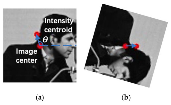 The SR-SYBA algorithm uses this angle to perform orientation normalization for the feature region to achieve rotation invariance. Figure 6 gives an illustration of this orientation representation estimation process. Figure 6a shows the representation of the orientation θ as the orientation of the vector from the center of the region to the intensity centroid. Figure 6b shows the orientation of the feature region after being normalized to θ = 0 degree.