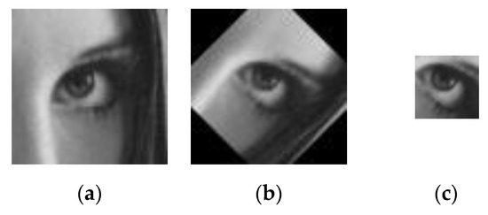 Further investigation on the scaling and rotation transformation demonstrates the effectiveness of our method. We denote as the scaled and rotated image of , with scale factor and rotation angle degrees. The relationship between and is shown in Equations (9) and (10).